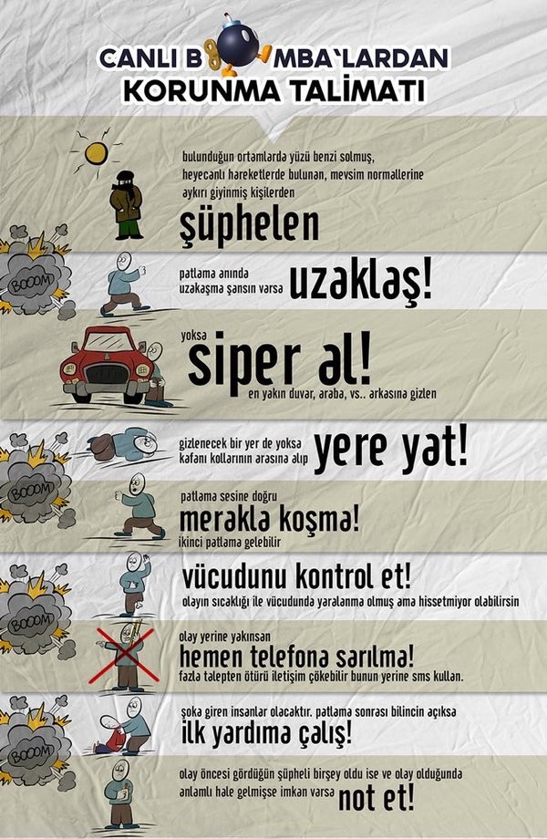 0 0 0 2 Canlı Bomba'lardan Korunma Talimatları Canlı Dergi Admin posted on 9 years ago — updated on 7 years ago 4,346 views Yaşam Haberler Son günlerde yaşadığımız acı olaylar neticesinde twitterda bulduğum bir tweeti buraya eklemek istedim...